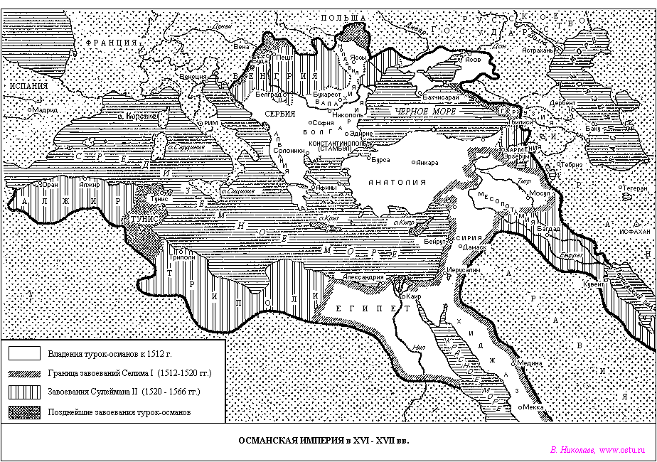 временем наибольшего военно-политического могущества Османской империи. В первой половине XVI в. она присоединила к своим владениям значительные территории на Ближнем Востоке и в Северной Африке. Разгромив в Чалдыранской битве 1514 г. персидского шаха Исмаила, а в 1516 г. в районе Алеппо войска египетских мамлюков, османский султан Селим I (1512-1529) включил в состав своего государства юго-восточную Анатолию, Курдистан, Сирию, Палестину, Ливан, Северную Месопотамию до Мосула, Египет и Хиджаз со священными городами мусульман Меккой и Мединой. С завоеванием Египта турецкая традиция связывает легенду о передаче турецкому султану титула халифа, т.е. заместителя, наместника пророка Мухаммеда на земле, духовного главы всех мусульман-суннитов. Хотя сам факт подобной передачи является более поздним